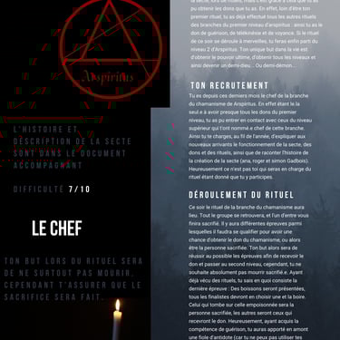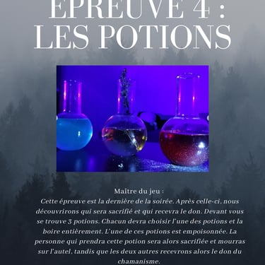 Dans ce scénario, 6 joueurs incarnent des personnages prenant part à un rituel organisé par une secte, culminant en un sacrifice final. Pour désigner la victime, 4 épreuves mettront les joueurs en compétition. Mais attention : chaque personnage a ses propres objectifs. Entre celui qui rêve d’être sacrifié, celui qui veut sauver tout le monde, ou encore celui qui cherche à éliminer son ennemi, alliances et trahisons rythmeront la partie. Serez-vous prêt à tout pour atteindre votre but ?