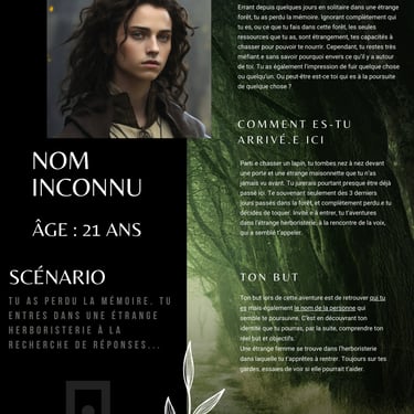 Avant de débuter, choisissez votre scénario et l'un des rôles associés. Bien que chaque scénario soit autonome, ils se déroulent tous dans le même lieu et univers. Ce fil conducteur apporte une continuité entre les sessions et une dimension sérielle à l'univers.